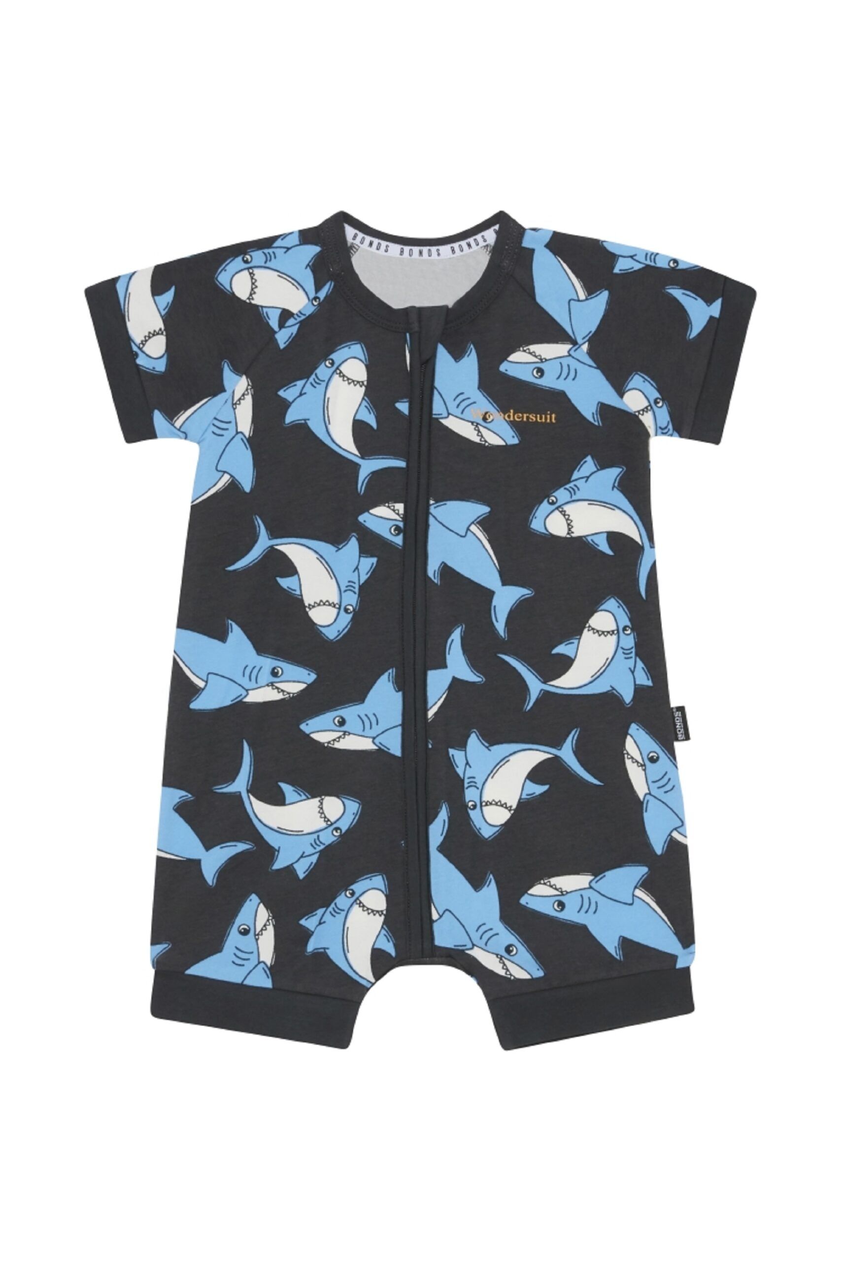 A shark romper made from super soft cotton with a fast nappy change design.
